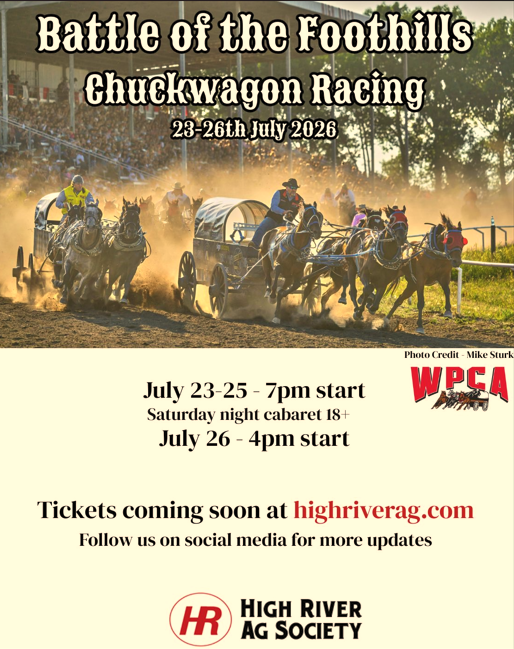 In High River, chuckwagon racing is more than just a sport—it's in our blood. Back in 1979, the High River Ag Society stepped up to host the legendary 'Battle of the Giants,' solidifying our town as a true home for the wagons. Today, the Battle of the Foothills carries on that tradition.